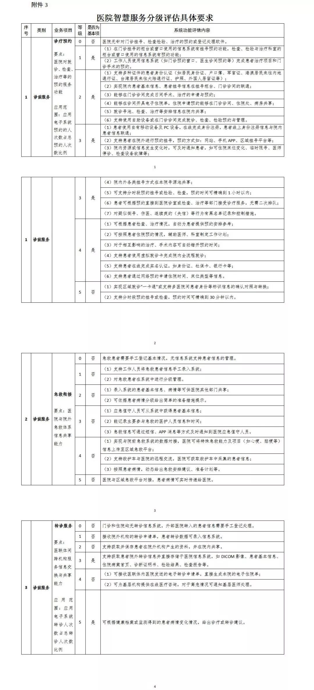 (四)3级:联通医院内外的智慧服务初步建立。电子病历的部分信息通过互联网在医院内外进行实时共享,部分诊疗信息可以在院外进行处理,并与院内电子病历信息系统实时交互。初步建立院内院外、线上线下一体化的医疗服务流程。