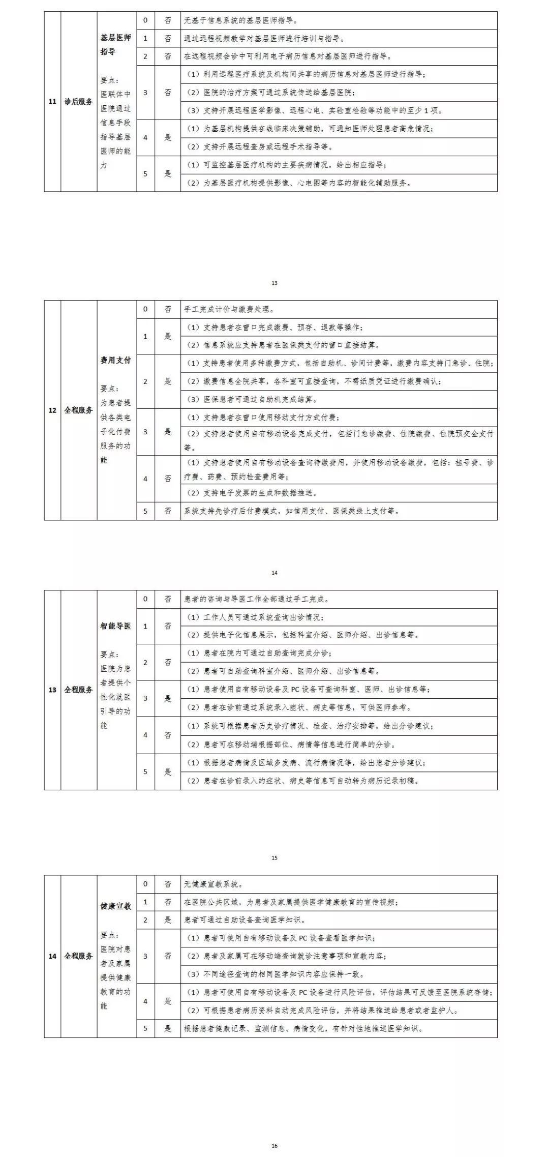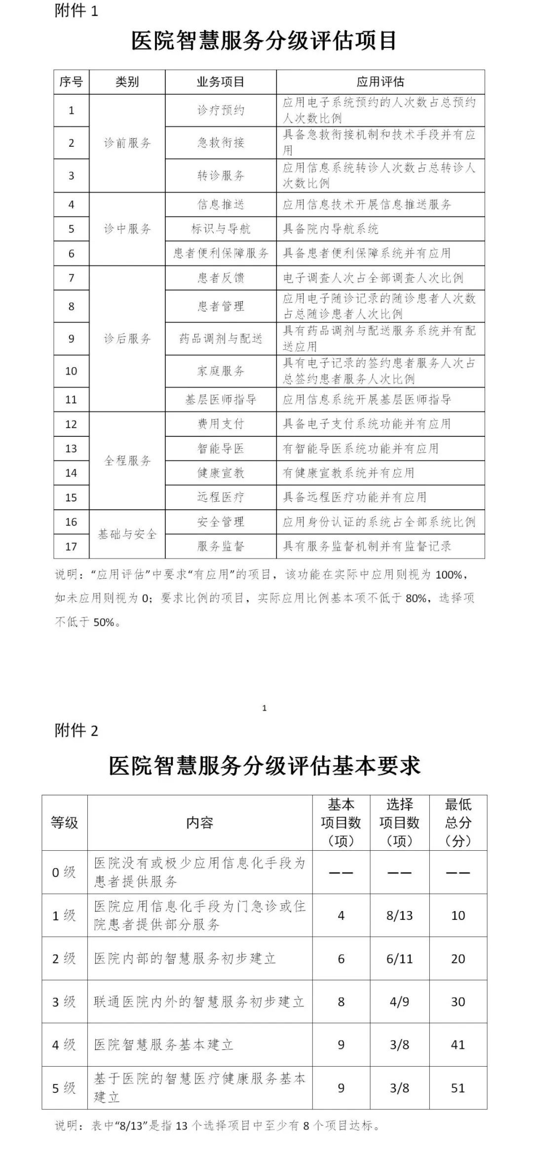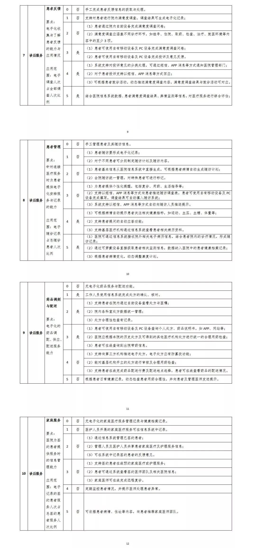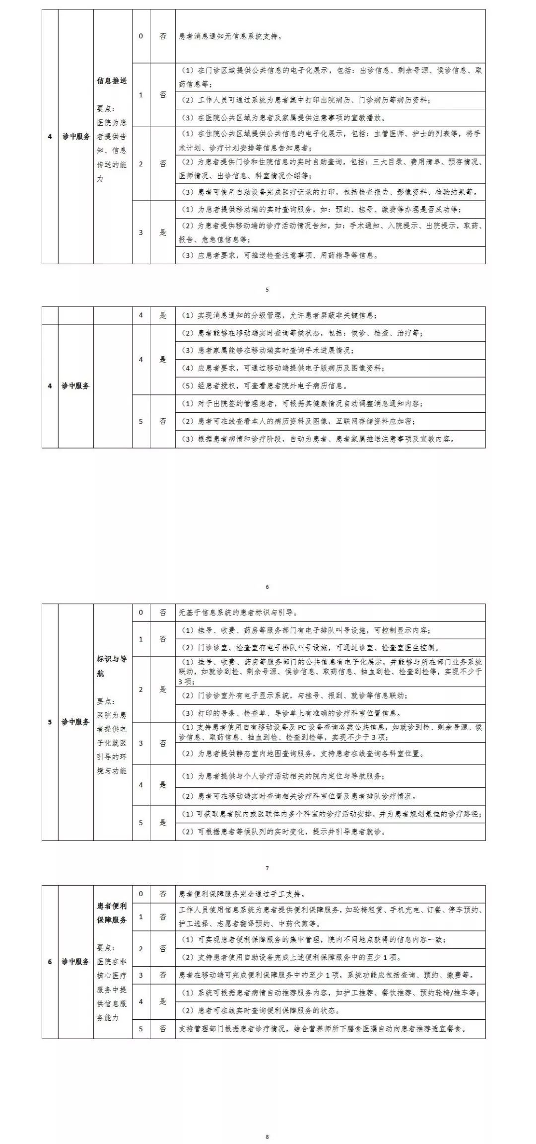 (二)整体应用水平评估。是对医院智慧服务信息系统整体应用情况的评估。具体方法是按照总分、基本项目完成情况、选择项目完成情况得到评估结果,分为0—5级共六个等级(各级评估要求见附件2)。